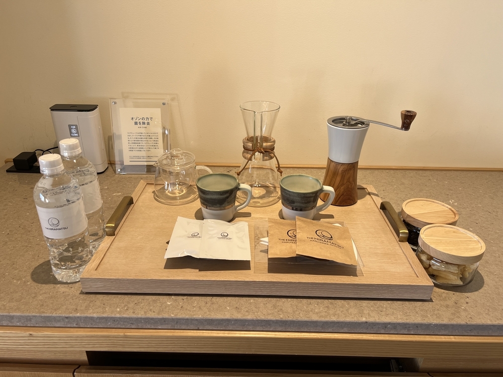 バーコーナーにはお茶のセットや、コーヒー豆、ミル、お菓子など。